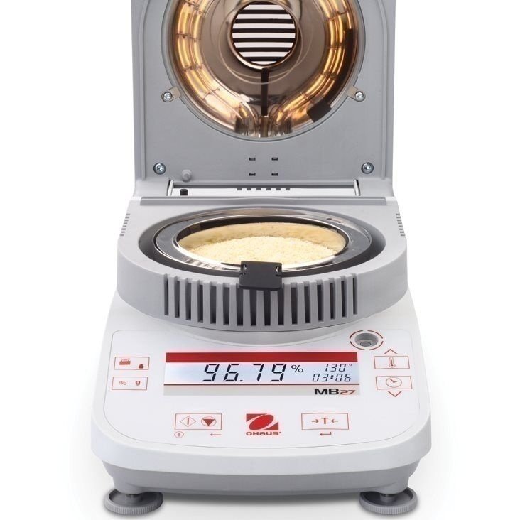 Balança Determinadora de Umidade Ohaus MB27 90g é um equipamento de laboratório para medir ou analisar o teor de umidade em amostras, principalmente do tipo alimentos como grãos, cereais, frutas, principalmente.