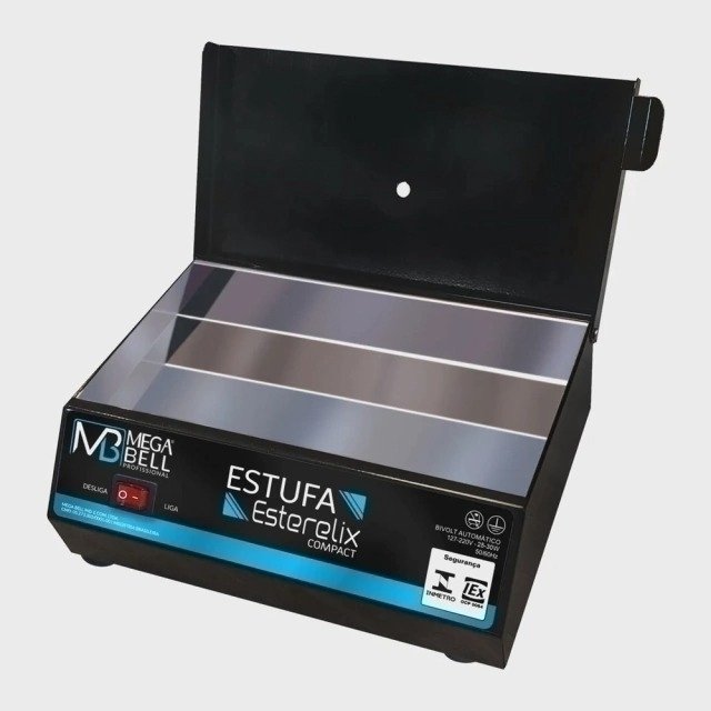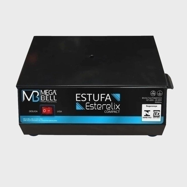 estufa esterelix compact mega bell na cor preta é um equipamento portátil destinado ao uso doméstico, para esterilização de alicates de manicure e pequenos instrumentos em geral, em aço inox. Foi desenvolvida para atingir uma temperatura ao redor de 170°C, com variação + – 10%, e permanece assim enquanto estiver ligada, para interromper o aquecimento, deve-se acionar a chave liga/desliga.